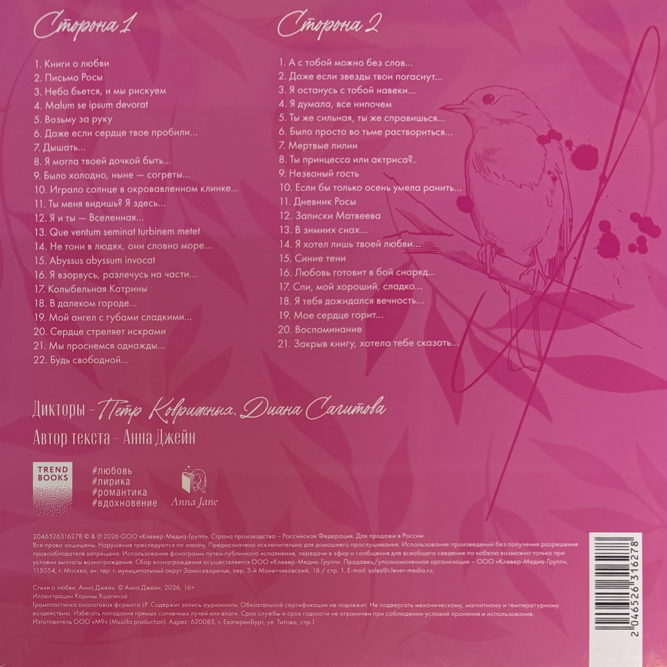 Винил купить Анна Джейн - Стихи о любви (Россия 2026г.)в магазине Мир винила в Москве. Цена пластинки 4700 руб. Доставка по РФ и СНГ